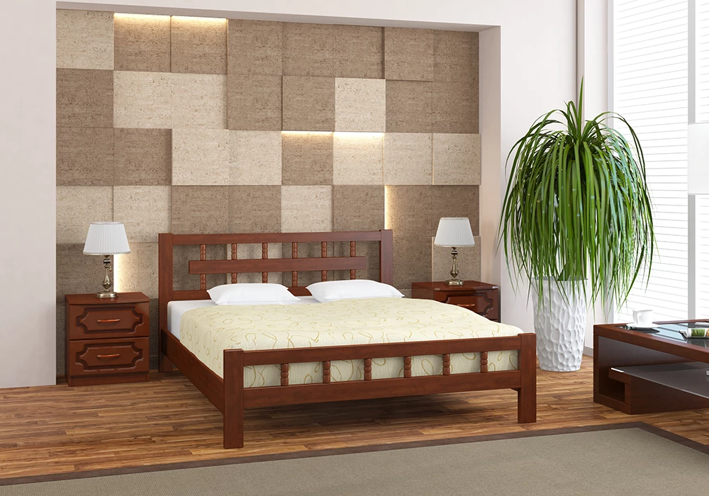 Кровать "Натали-5" изготовлена из массива сосны с элементами из МДФ. Кровать оборудована встроенным основанием. Кровать может комплектоваться как матрасом односторонней мягкости на жестком каркасе, так и металлическим каркасом с ламелями под 2-сторонний матрас.